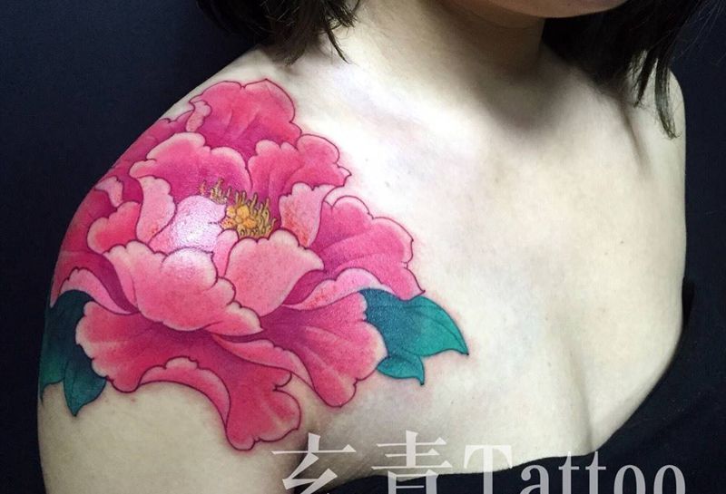 当前位置: 首页 >内蒙古呼和浩特市纹身店-玄青Tattoo纹身图案>肩头牡丹花纹身图片_成品肩部传统清新国画植物原创纹身图案