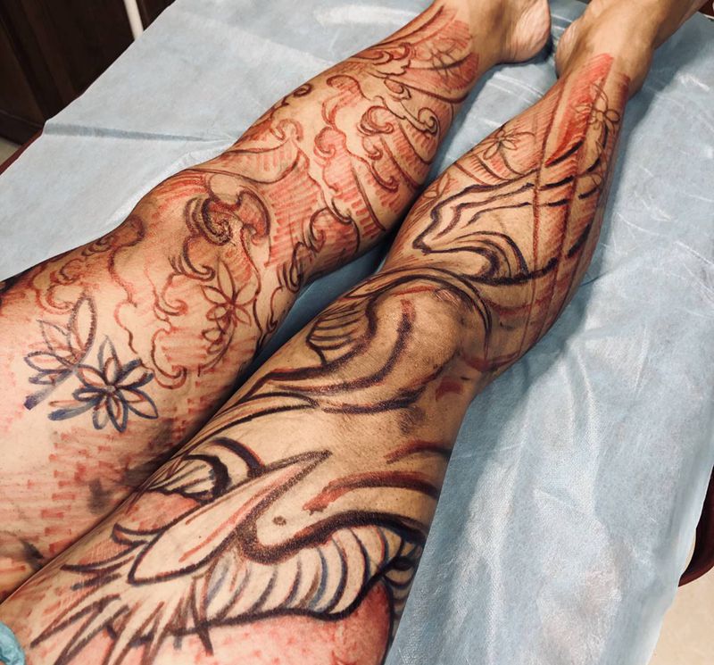 • T网红王老大花腿龙纹身图片_腿部新传统纹身图案