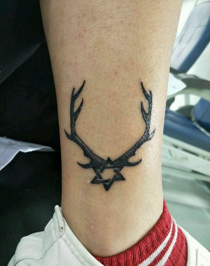 当前位置: 首页 >内蒙古呼和浩特市纹身店-墨刺云刻文身馆纹身图案>鹿角纹身图片_腿部图腾鹿角星纹身图案