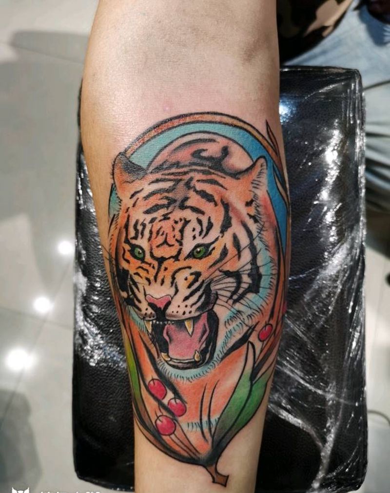 当前位置: 首页 >内蒙古包头市纹身店-愿纹奇身纹身图案>彩色虎头纹身图片_手臂New School纹身图案