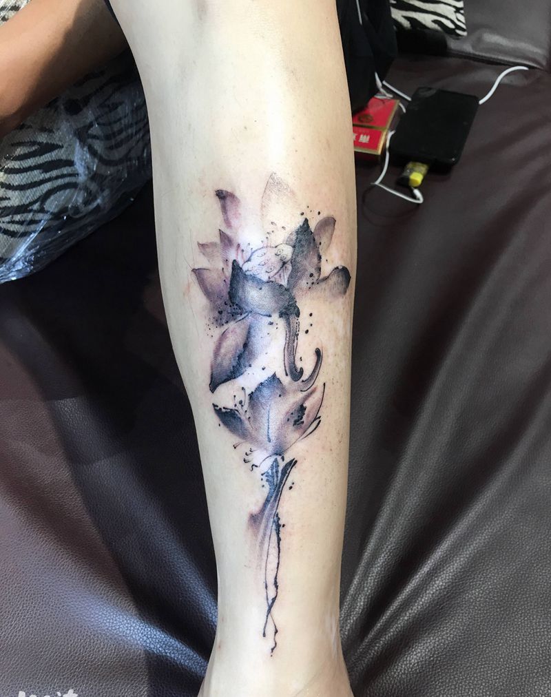 遮盖 墨莲纹身图片_腿部水墨纹身图案