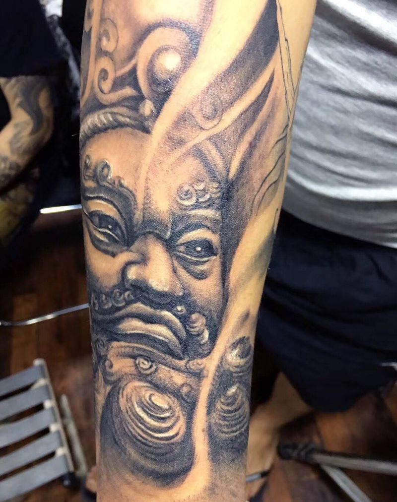 当前位置: 首页 >内蒙古包头市纹身店-愿纹奇身纹身图案>天王纹身图片_传统人物手臂手稿纹身图案
