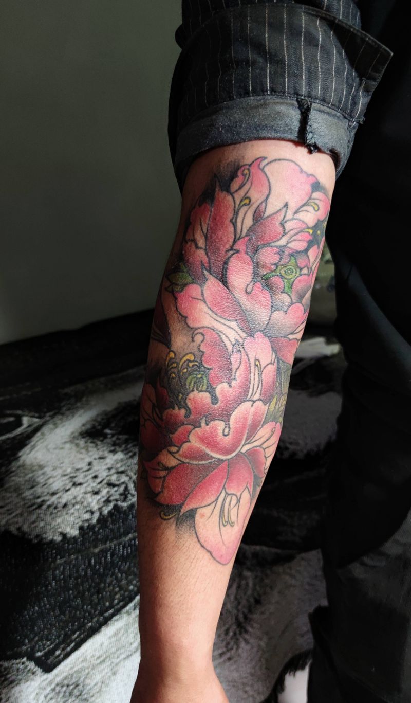 当前位置: 首页 >内蒙古呼和浩特市纹身店-點墨刺青纹身图案>手臂牡丹纹身图片_手臂新传统彩色牡丹纹身图案