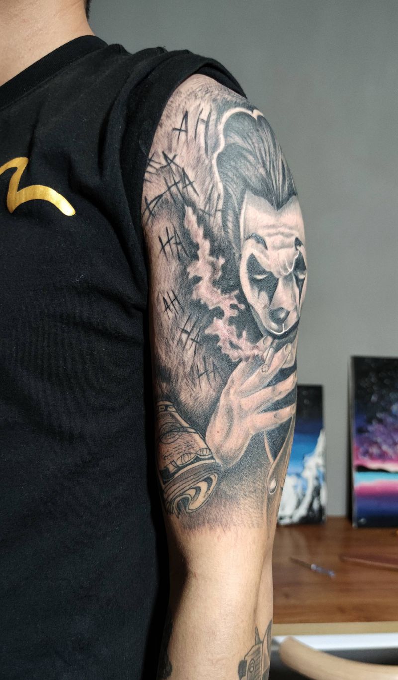 当前位置: 首页 >内蒙古呼和浩特市纹身店-點墨刺青纹身图案>小丑纹身图片_手臂欧美写实黑灰素描纹身图案