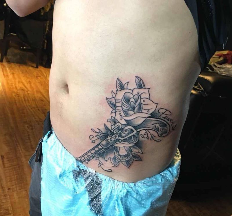 枪与玫瑰纹身图片_腹部欧美植物原创纹身图案