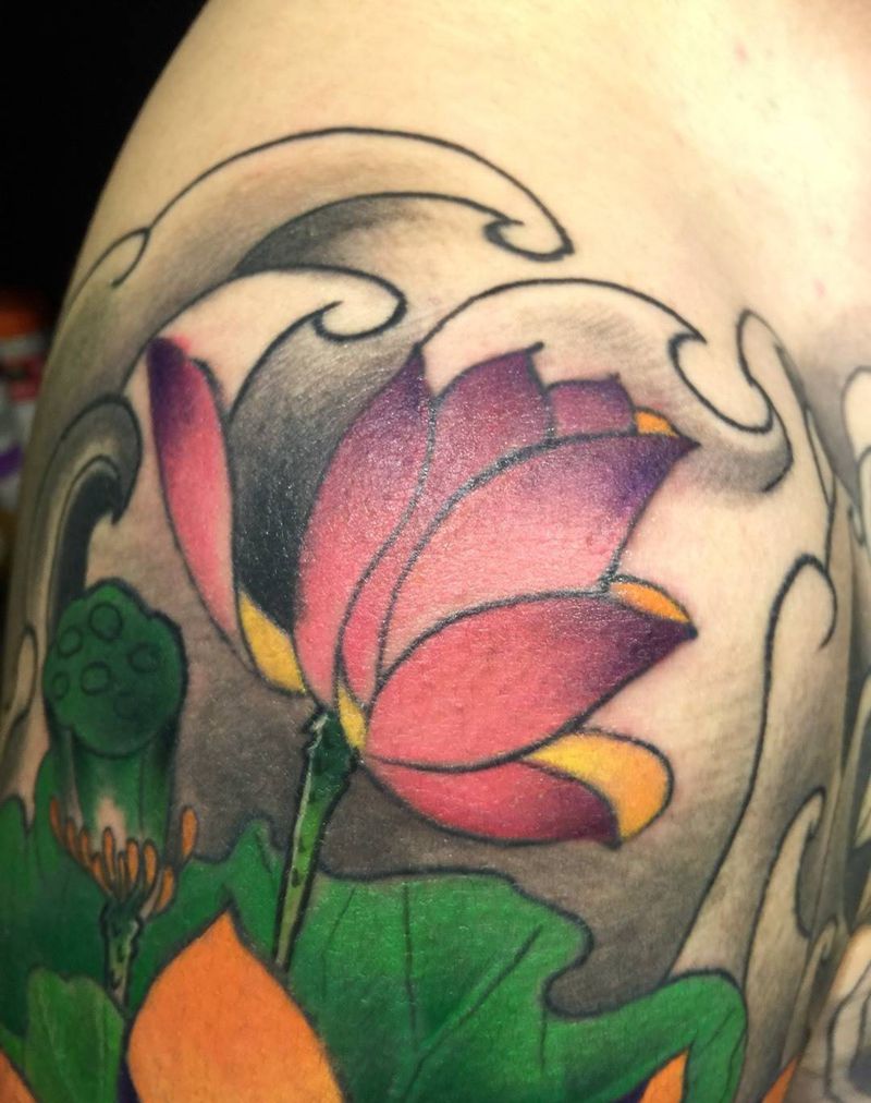 当前位置: 首页 >内蒙古呼和浩特市纹身店-點墨刺青纹身图案>传统彩色半甲纹身图片