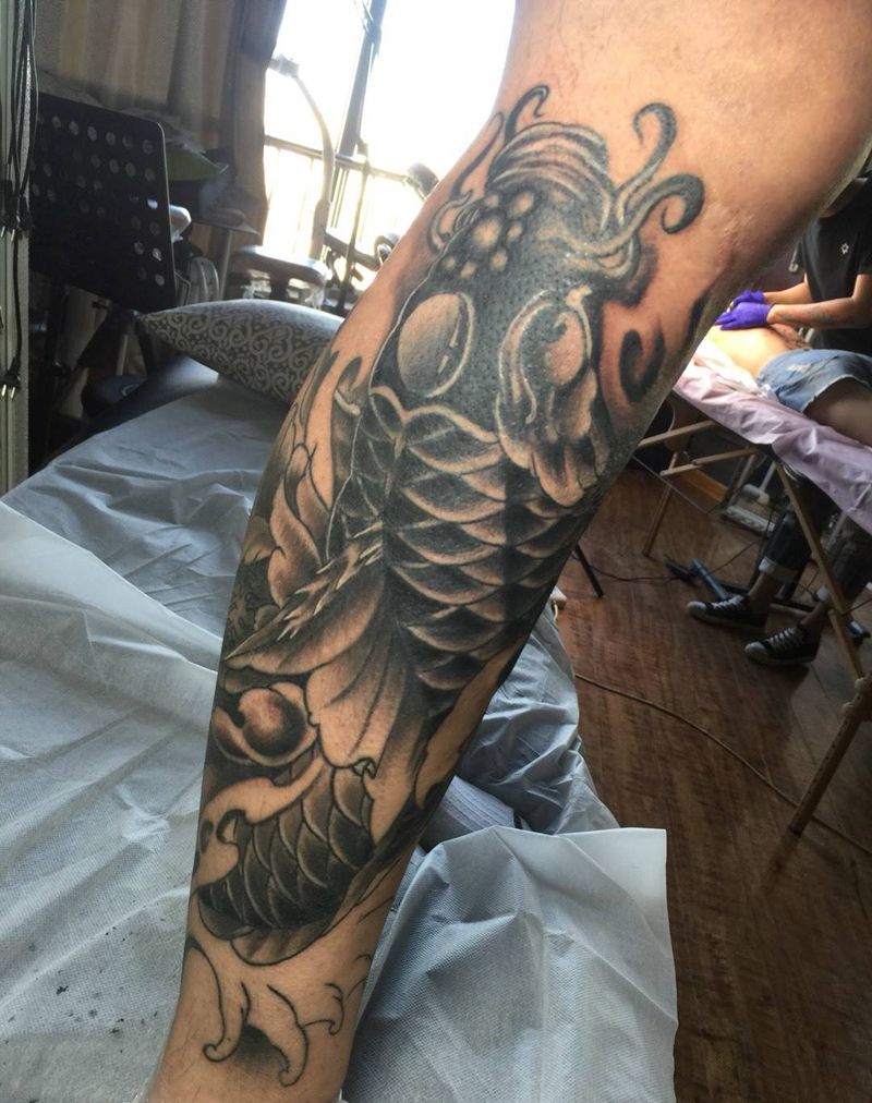 当前位置: 首页 >内蒙古呼和浩特市纹身店-點墨刺青纹身图案>包小腿大黑鲤子未完纹身图片