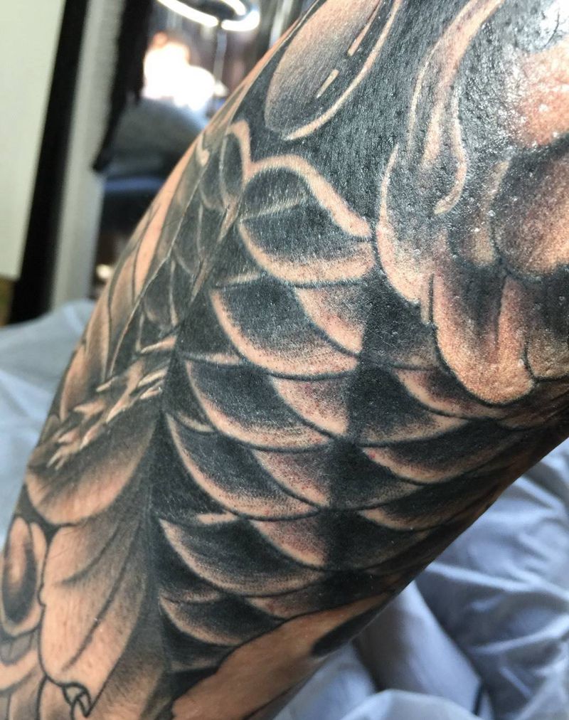 当前位置: 首页 >内蒙古呼和浩特市纹身店-點墨刺青纹身图案>包小腿大黑鲤子未完纹身图片