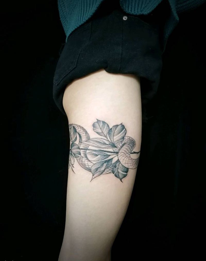 腿环蛇与花纹身图片_腿部腰部点刺水墨纹身图案