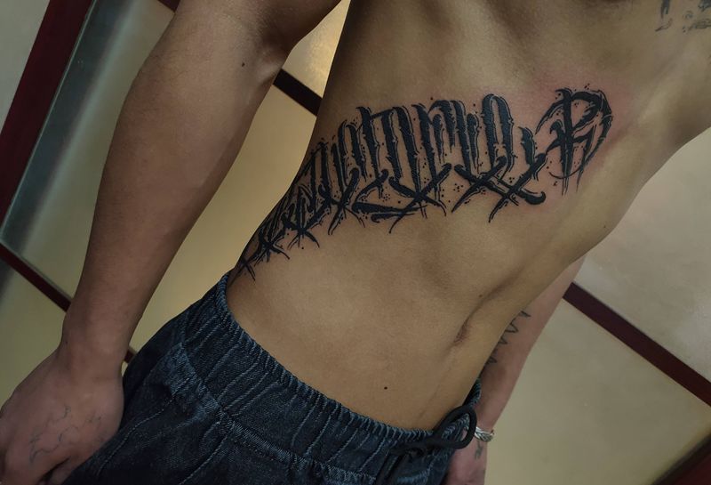 当前位置: 首页 >内蒙古呼和浩特市纹身店-守义阁刺青工作室纹身图案>花体英文纹身图片_腰部花体字纹身图案