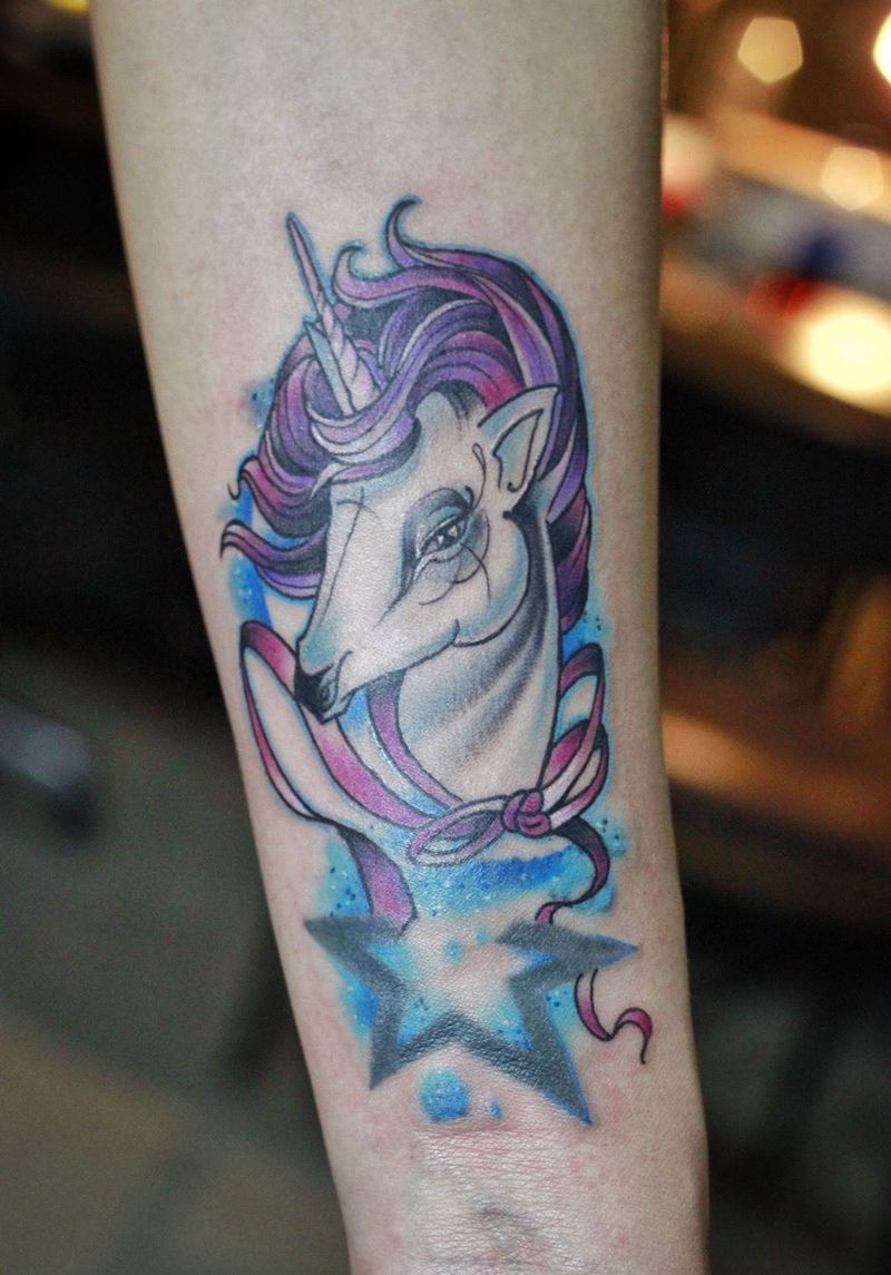 当前位置: 首页 >内蒙古包头市纹身店-金雕刺青Tattoostudio纹身图案>独角兽纹身图片_手臂New School纹身图案