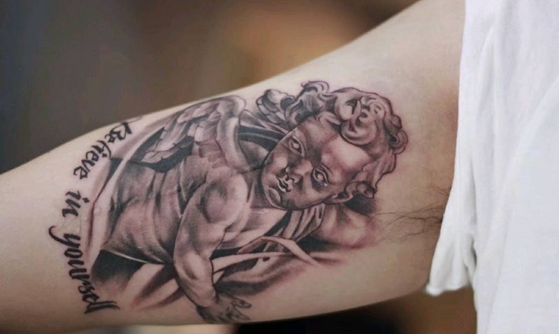 当前位置: 首页 >内蒙古包头市纹身店-金雕刺青Tattoostudio纹身图案>天使纹身图片_手臂欧美肖像写实成品纹身图案