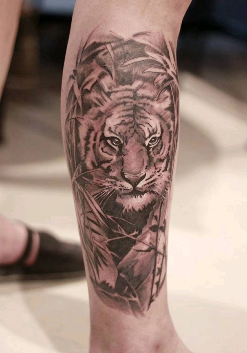 虎纹身图片_腿部写实动物成品纹身图案