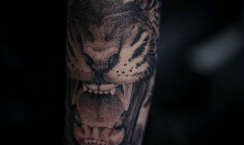 当前位置: 首页 >内蒙古包头市纹身店-金雕刺青Tattoostudio纹身图案>写实老虎纹身图片_手臂欧美写实动物成品纹身图案
