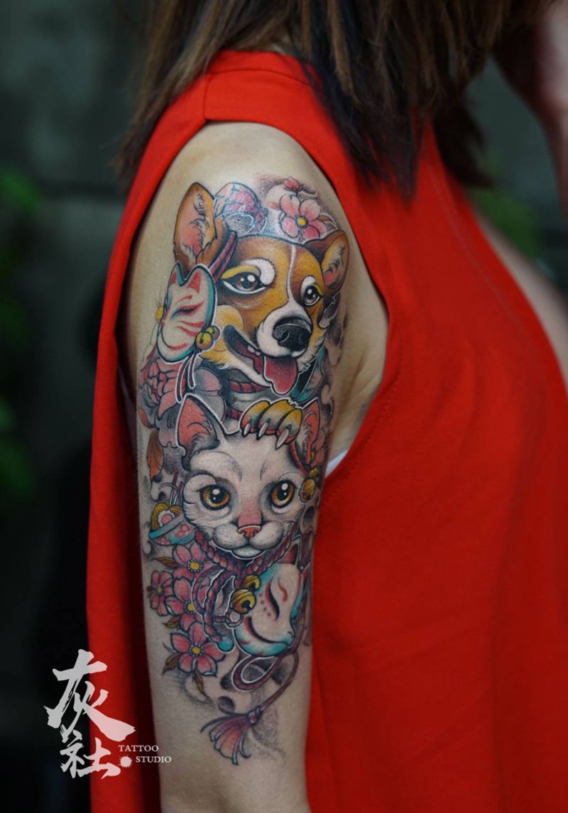 当前位置: 首页 >内蒙古呼和浩特市纹身店-灰社纹身工作室纹身图案>猫狗宠物纹身图片_手臂New School纹身图案
