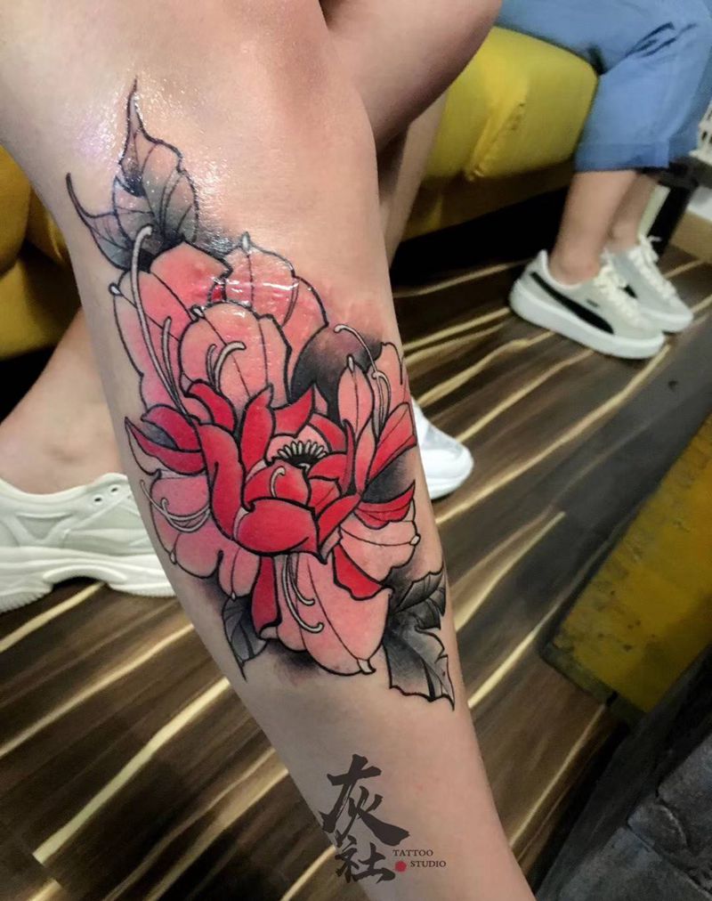 遮盖疤痕纹身图片_腿部New School遮盖疤痕牡丹纹身图案