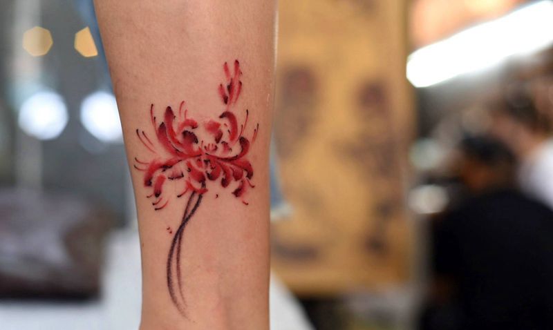 当前位置: 首页 >内蒙古包头市纹身店-超凡刺青纹身图案>彼岸花纹身图片_腿部脚部水彩水墨花纹身图案