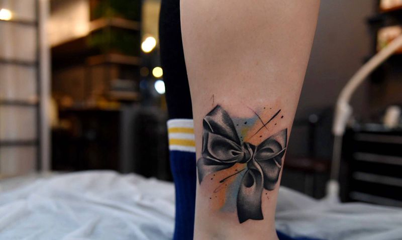 水彩蝴蝶结纹身图片_腿部水彩水墨纹身图案