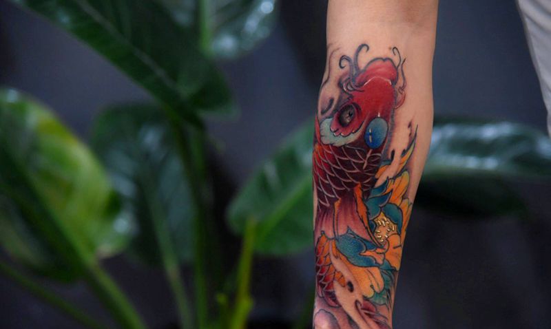 店内师傅作品鲤鱼纹身图片_手臂新传统红鲤鱼纹身图案
