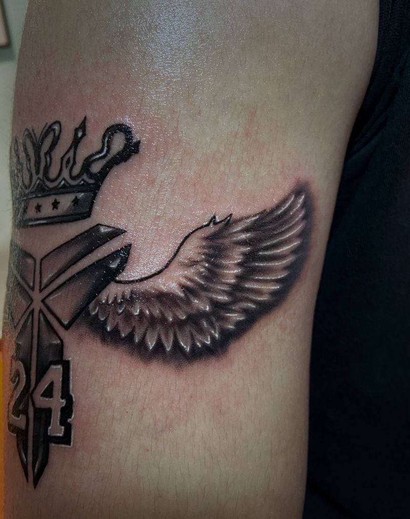 当前位置: 首页 >内蒙古包头市纹身店-AK刺青纹身图案>科比24号巴曼德纹身图片_手臂欧美写实纹身图案