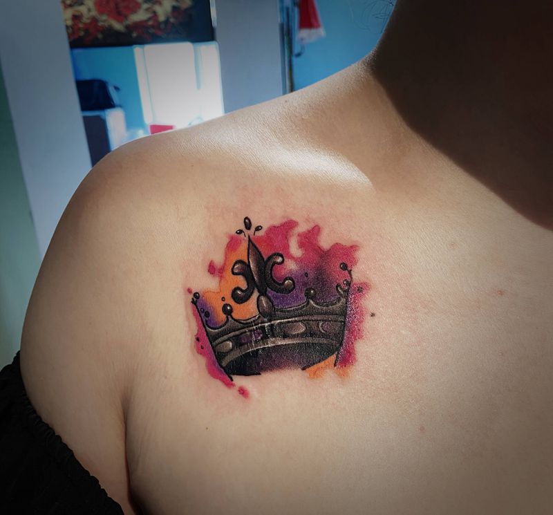 皇冠疤痕遮盖纹身图片_肩部水彩纹身图案