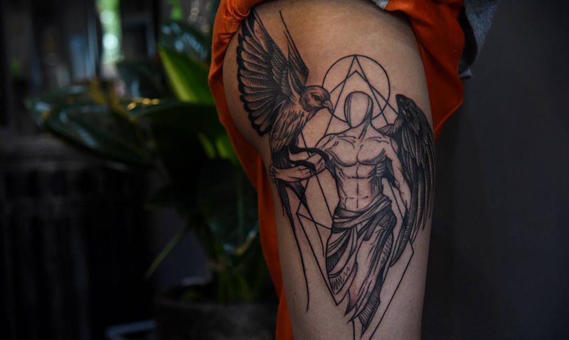 当前位置: 首页 >内蒙古包头市纹身店-超凡刺青纹身图案>折翼天使纹身图片_腿部点刺几何纹身图案