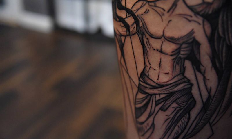 当前位置: 首页 >内蒙古包头市纹身店-超凡刺青纹身图案>折翼天使纹身图片_腿部点刺几何纹身图案