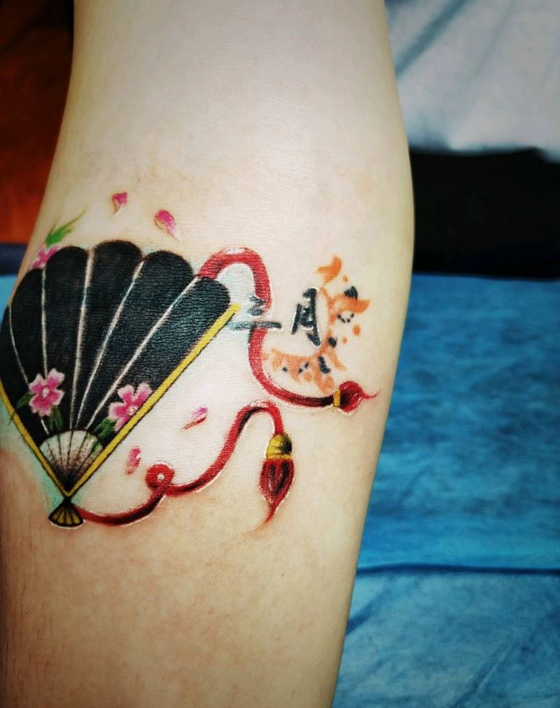 手绘遮盖纹身图片_手臂新传统扇子纹身图案