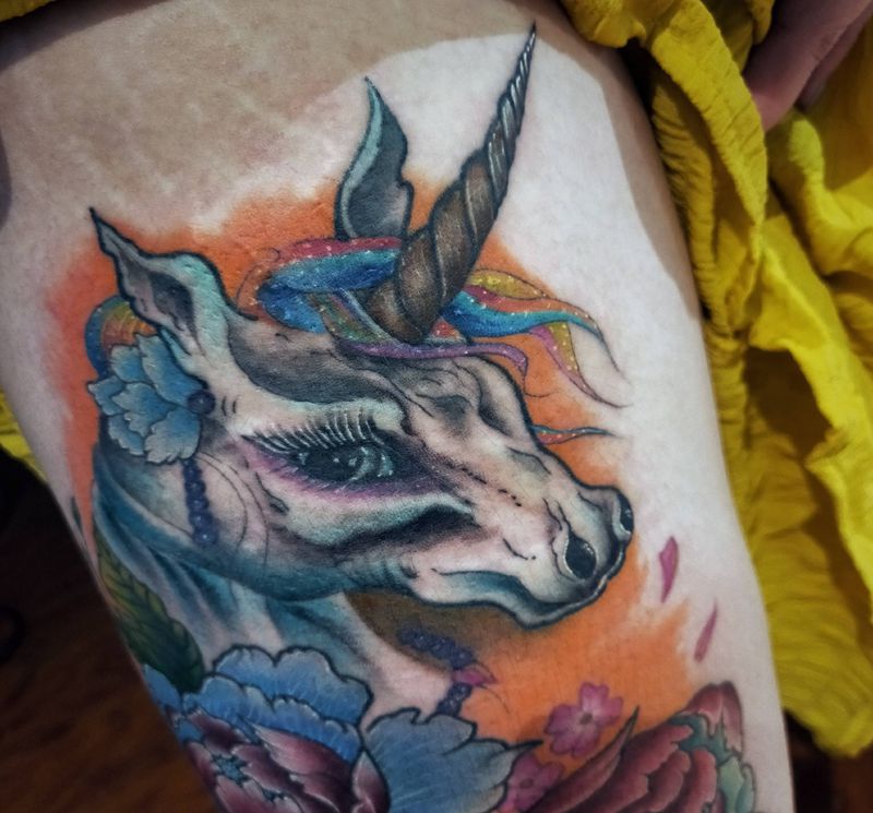 牡丹独角兽纹身图片_腿部New School纹身图案
