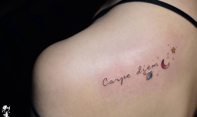 小清新纹身图片_背部肩部水彩小清新字母纹身图案