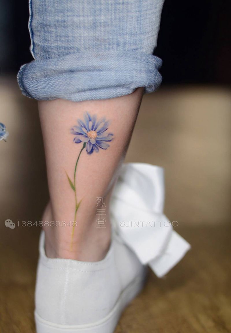 当前位置: 首页 >内蒙古包头市纹身店-烈丰堂刺青纹身图案>蓝色雏菊纹身图片_插画腿部清新写实植物花朵纹身图案