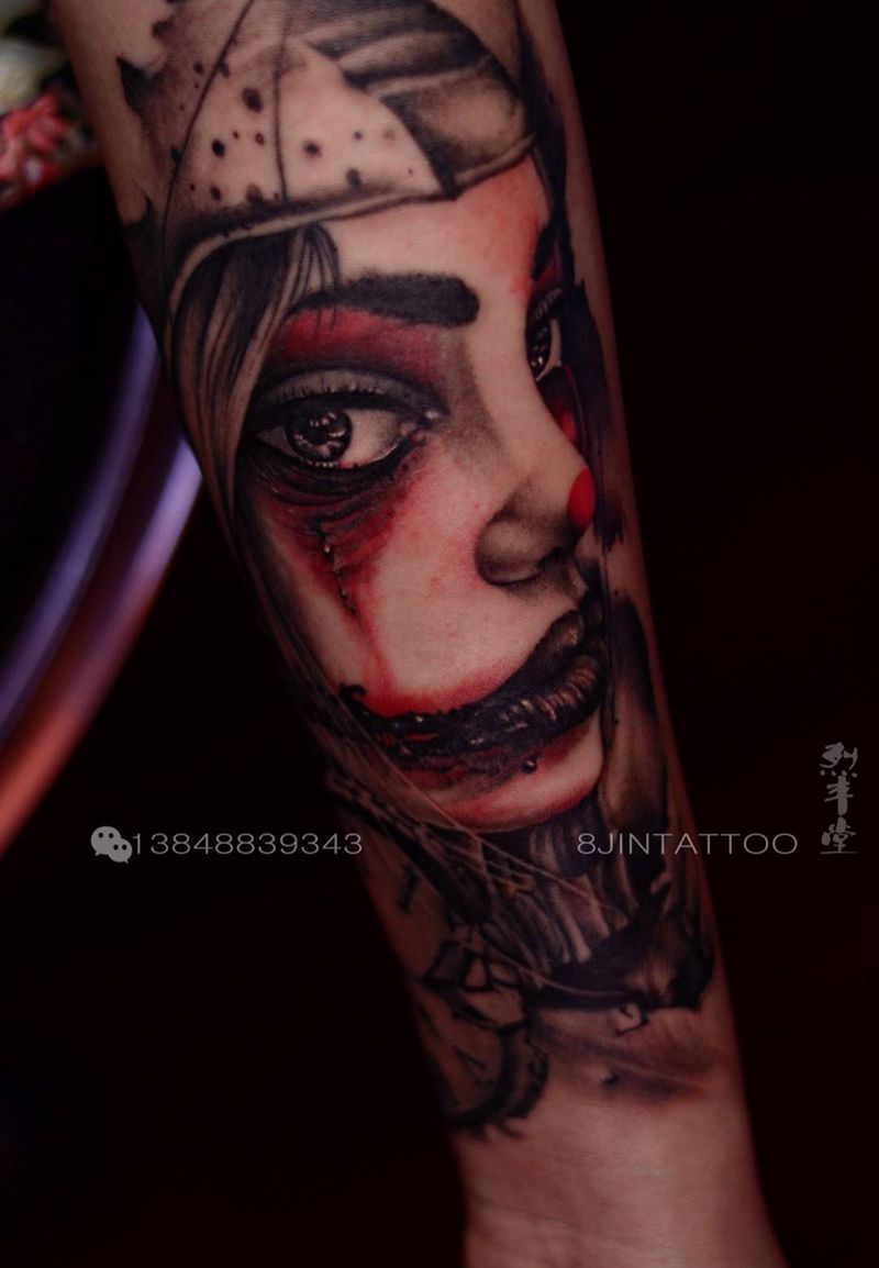 当前位置: 首页 >内蒙古包头市纹身店-烈丰堂刺青纹身图案>女小丑纹身图片_成品插画手臂欧美肖像写实人物纹身图案