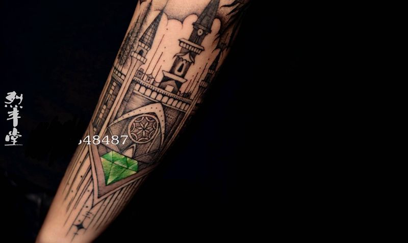 她的大城堡纹身图片_手臂几何欧美写实城堡包小臂原创纹身图案