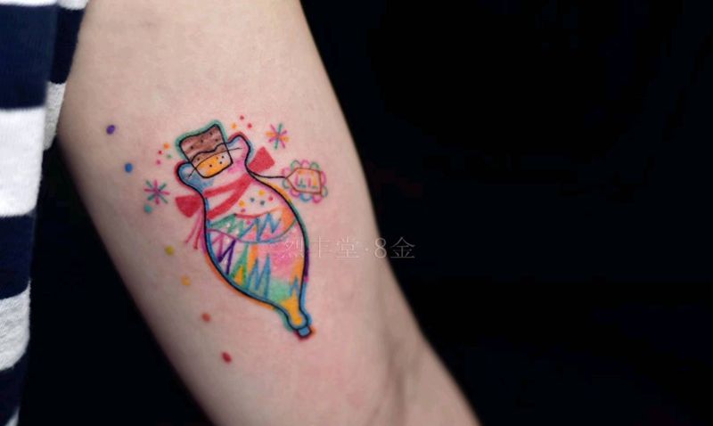 当前位置: 首页 >内蒙古包头市纹身店-烈丰堂刺青纹身图案>多彩小瓶子纹身图片_手臂水彩瓶子纹身图案