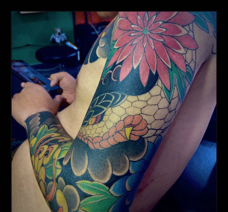 当前位置: 首页 >内蒙古包头市纹身店-至尊刺青纹身图案>日式蛇花臂纹身图片_手臂老传统蛇菊花纹身图案