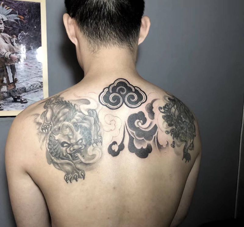 祥云纹身图片_背部新传统点刺祥云纹身图案