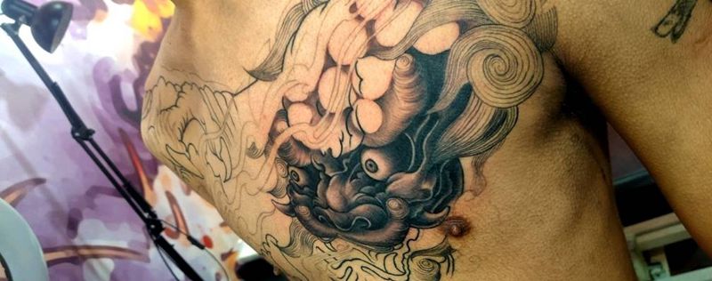 当前位置: 首页 >内蒙古包头市纹身店-福诚刺青纹身图案>唐狮(花胸)纹身图片_胸部新传统纹身图案