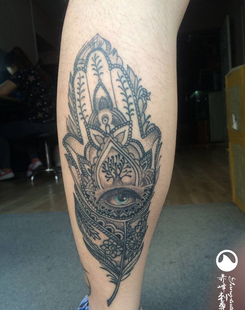 赤峰刺尊堂纹身图片_腿部几何点刺纹身图案