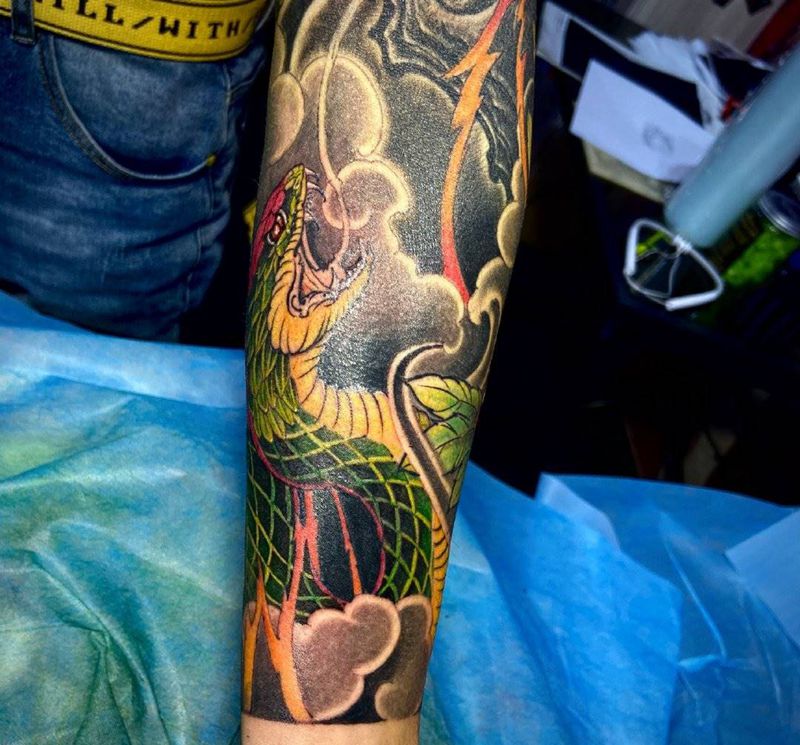• T网红王老大花腿龙纹身图片_腿部新传统纹身图案