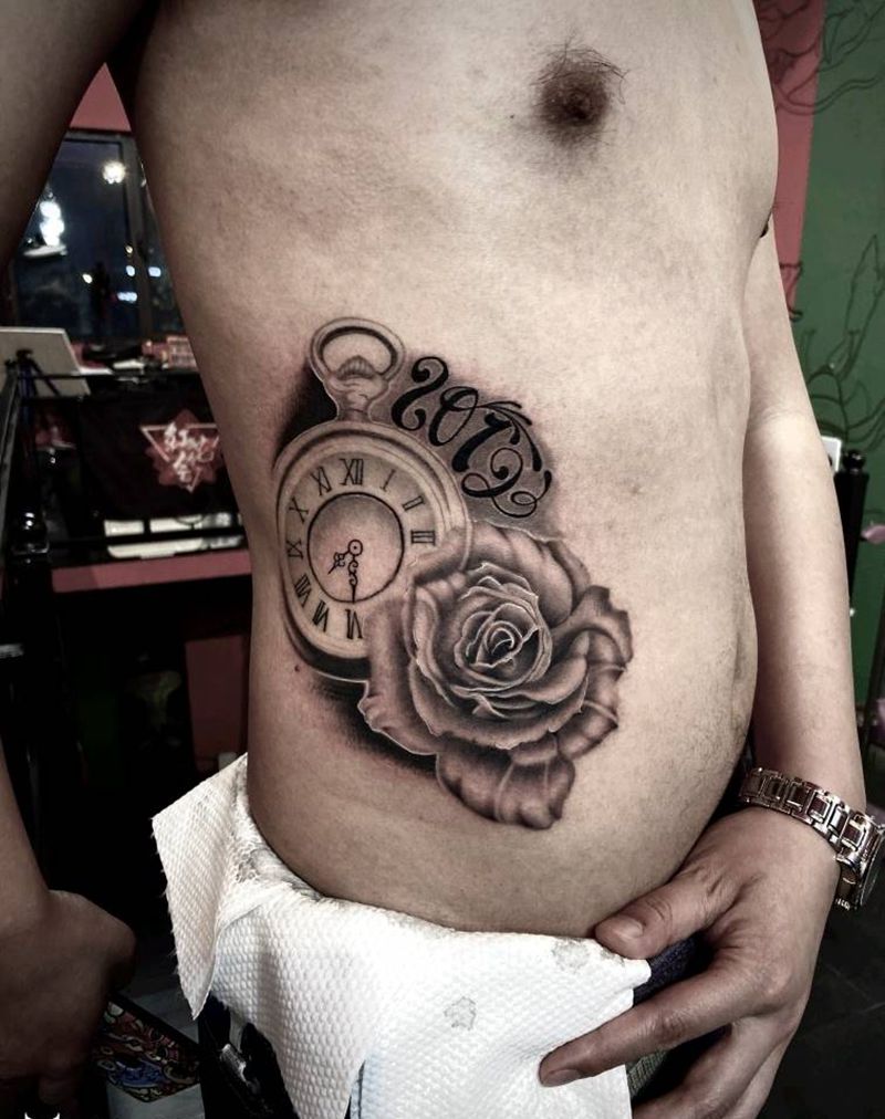 玫瑰与怀表纹身图片_腹部欧美写实纹身图案