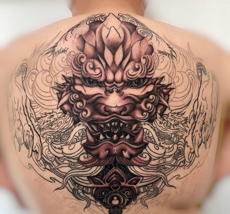半背唐狮纹身图片_背部新传统唐狮子半背新传统纹身图案