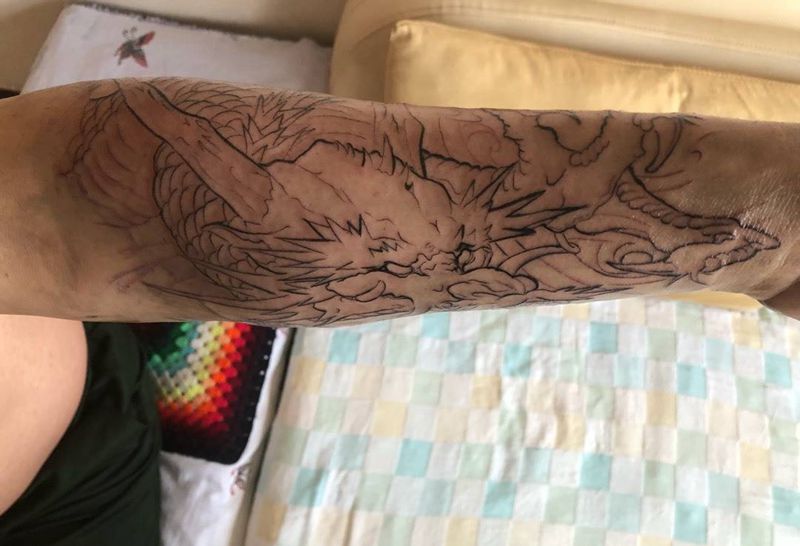• T网红王老大花腿龙纹身图片_腿部新传统纹身图案