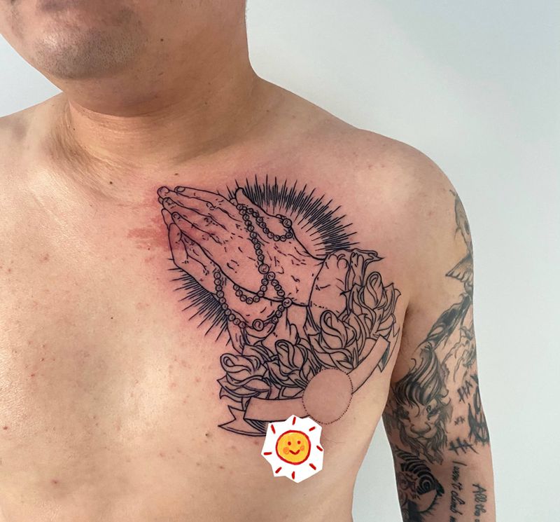 祈祷之手纹身图片_胸部几何Old School祈祷之手胸部old school纹身图案
