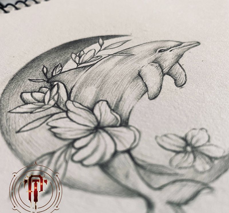 海豚纹身图片_手臂新传统海豚花卉月亮纹身图案