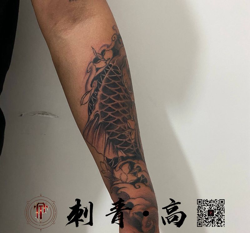 锦鲤上色纹身图片_手臂新传统鱼纹身图案