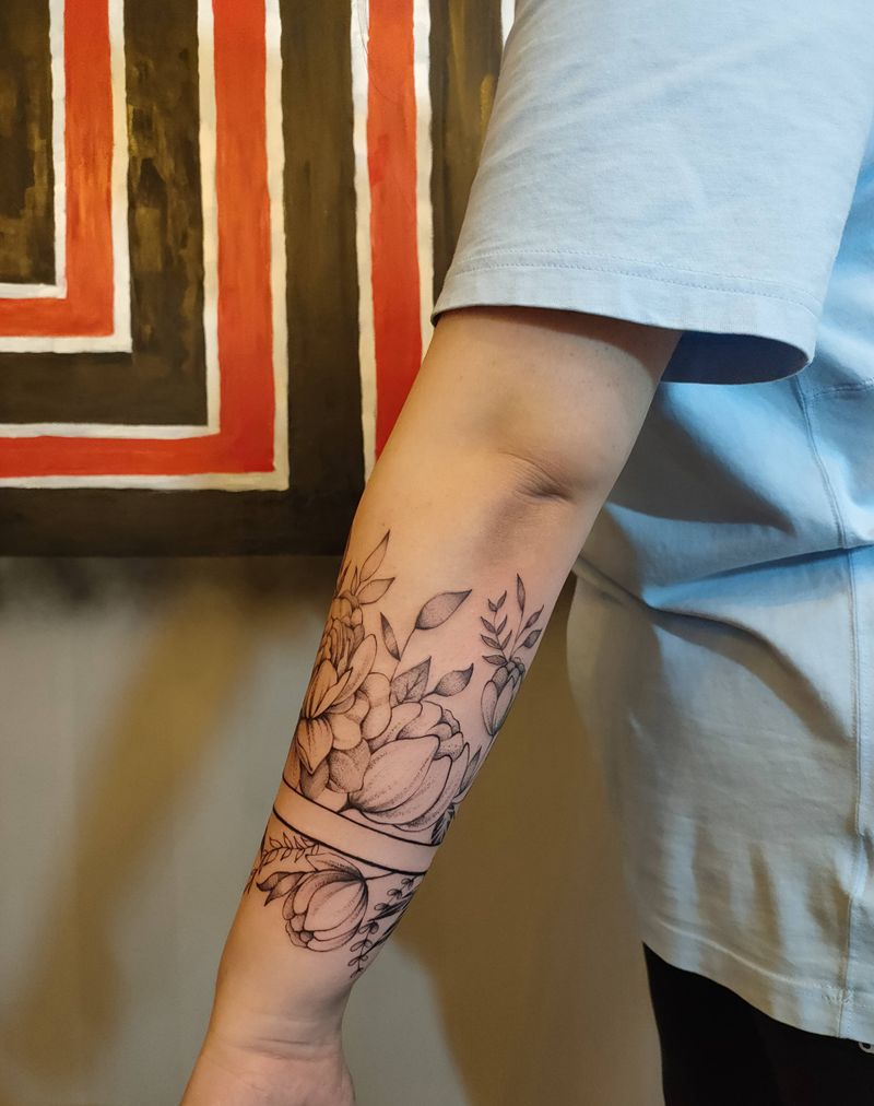 牡丹素花纹身图片_手臂点刺几何修改牡丹素花纹身图案