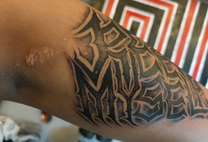 当前位置: 首页 >内蒙古赤峰市纹身店-回山刺青纹身图案>Keep my self纹身图片_手臂花体字纹身图案