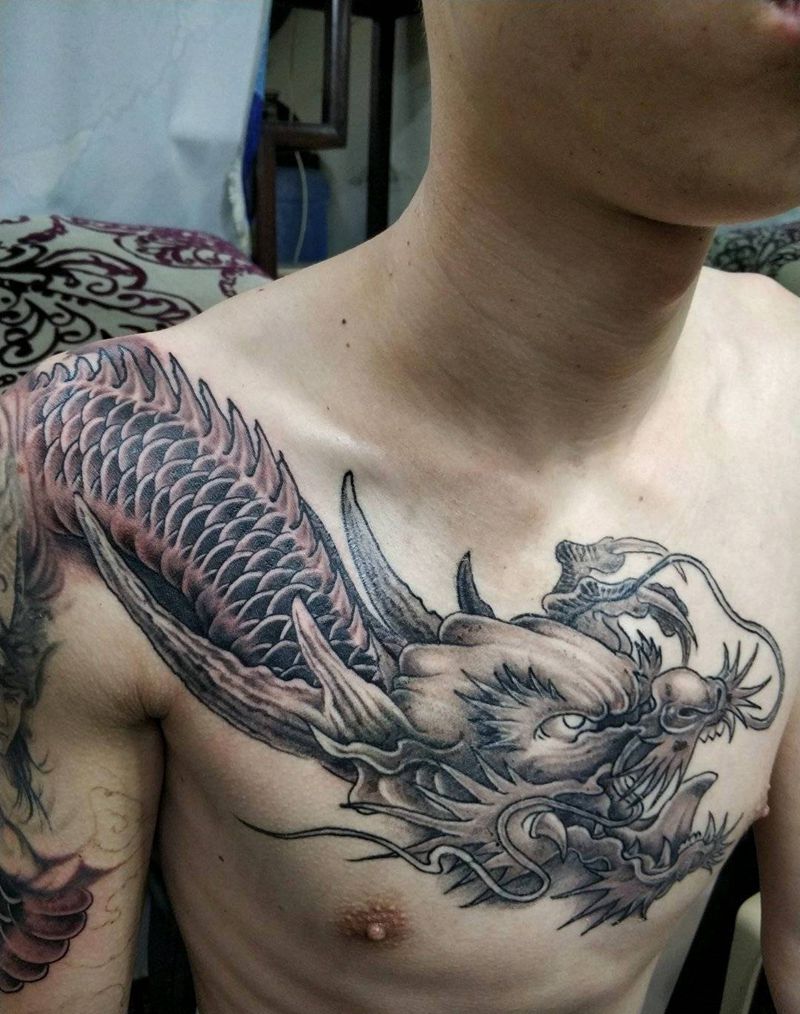 花臂过肩龙纹身图片_手臂胸部老传统新传统龙纹身图案