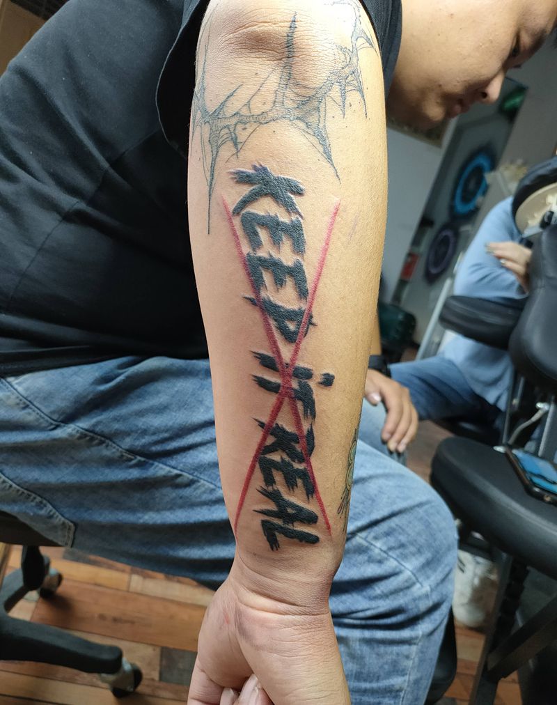 当前位置: 首页 >内蒙古赤峰市纹身店-回山刺青纹身图案>NO KEEP IT REAL纹身图片_手臂花体字硬核纹身图案