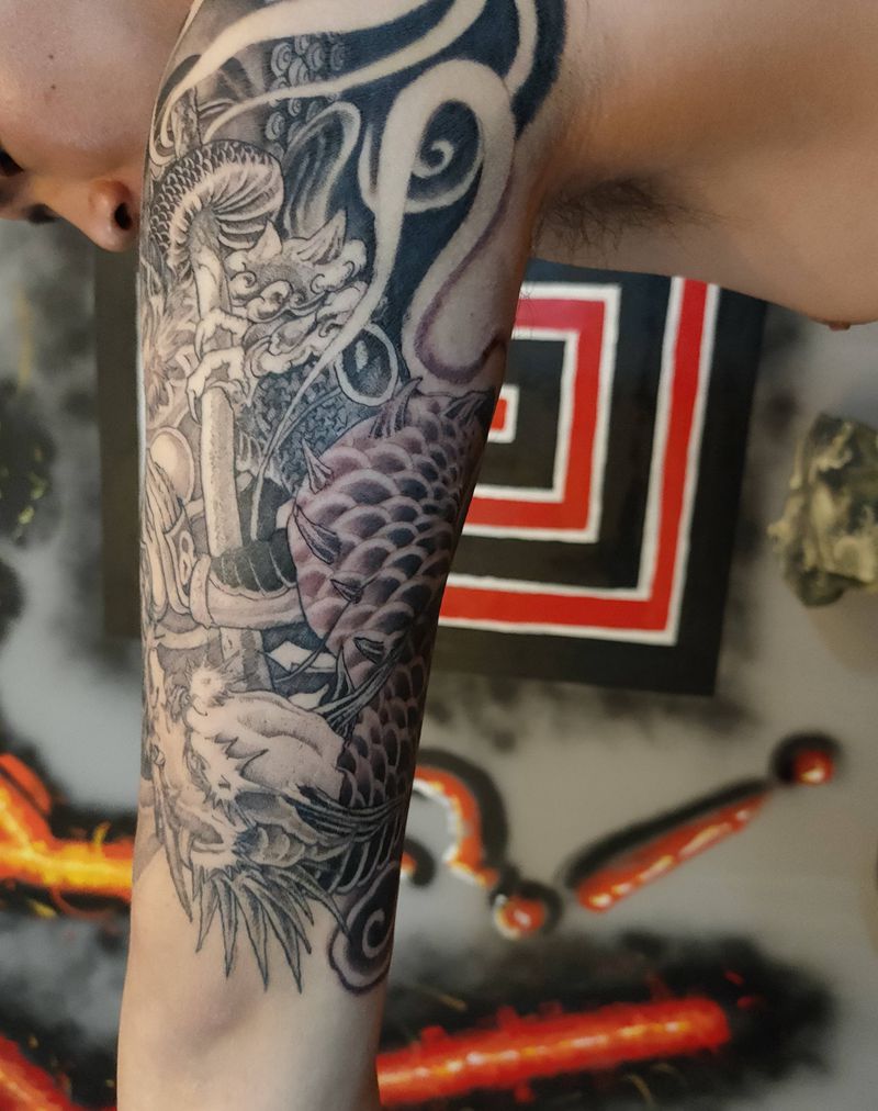 • T网红王老大花腿龙纹身图片_腿部新传统纹身图案